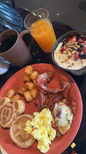 👑 Comida: Para el desayuno frutas, hotcakes, huevos, Mickey wafles y más, para la comida pollo frito, puré de papas, vegetales, varios postres, camarones y más. Este restaurante es Family Style, lo que significa que los meseros pondrán toda la comida en el centro de la mesa y cada comensal podrá servirse en su propio plato.